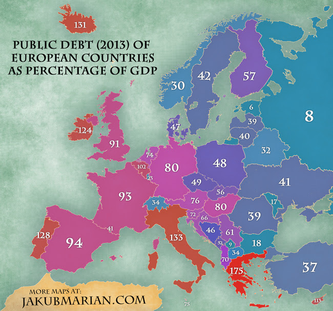 Το Open Europe «χαρτογράφησε» με δύο τρόπους την Ευρώπη. Στον ένα χάρτη, καταγράφεται το ποσοστό του δημόσιου χρέους με βάση το ΑΕΠ, με την Ελλάδα να είναι στην κορυφή της δυσάρεστης αυτής λίστας με 175%, ενώ ακολουθούν Ιταλία (133%) και Πορτογαλία (128%).